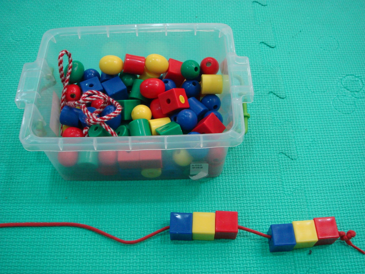 簡單的串珠,可以提供顏色分類、手眼協調、點數與數量以及順序排列的練習。市面上販售的串珠種類有很多樣式,包含不同形狀、不同顏色、或是有上面編寫了數字或是字母等,簡單的遊戲方式以分類、手眼協調以及雙手操作為主,有不同形狀或是數字的串珠,則可再增加練習複雜圖形區辨及數字排序,依照孩子的年紀與能力不同來做適當的練習。